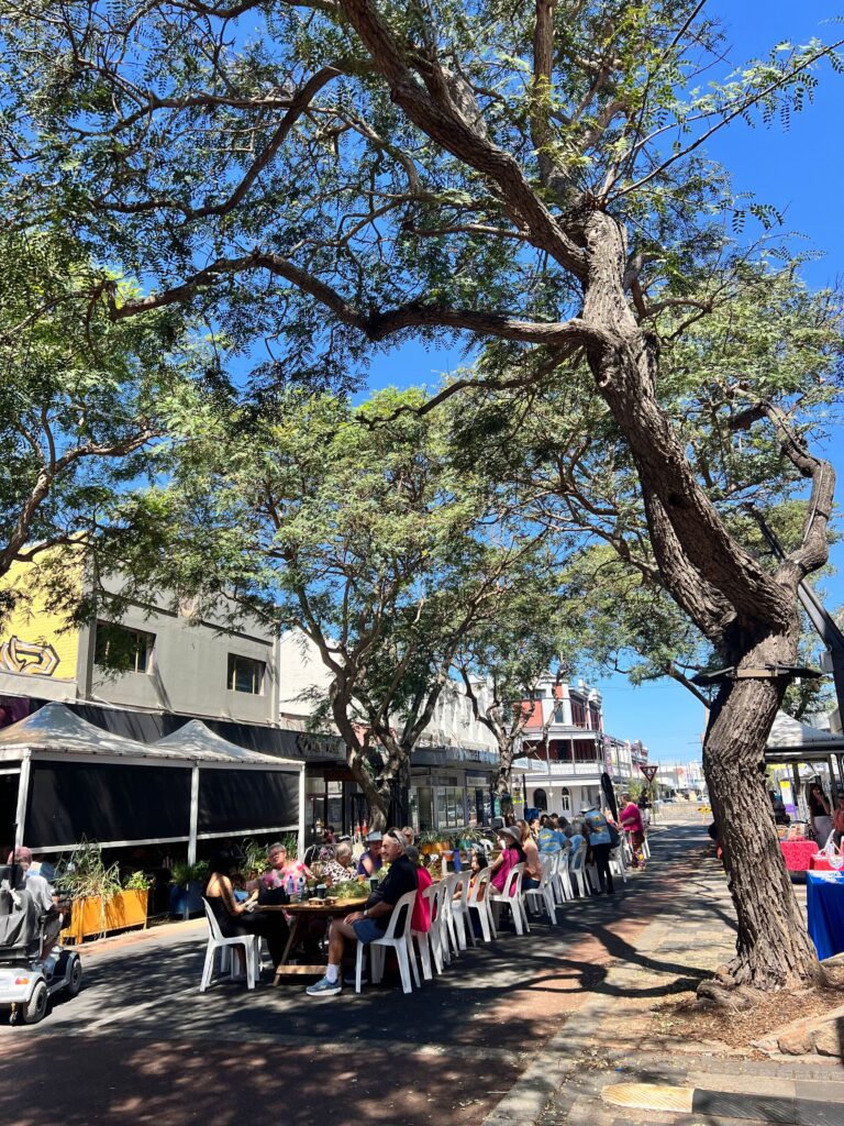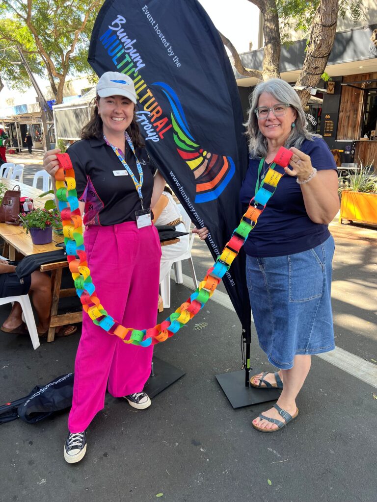 Blue Leaf Coordinator: Bec and Bunbury Multicultural Group Representative: Susane pictured holding paper chain with words symbolising harmony. Community members sit down in harmony for lunch