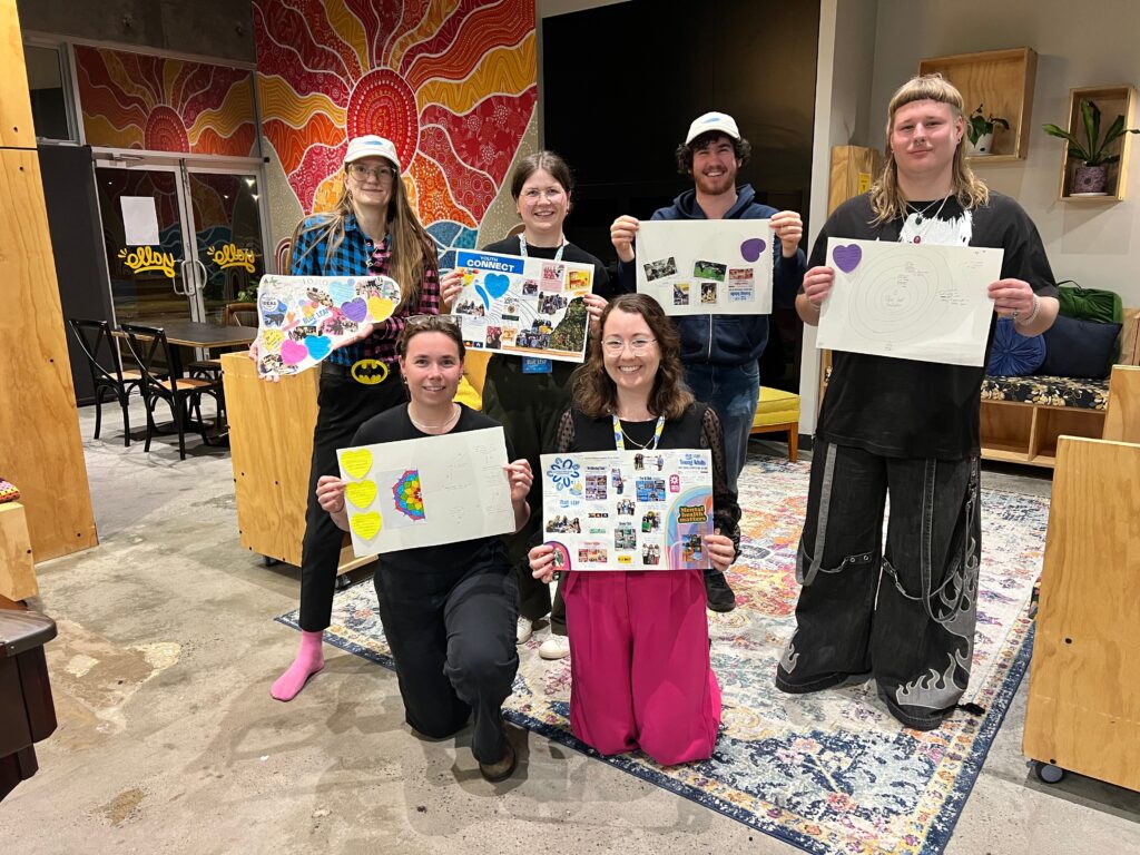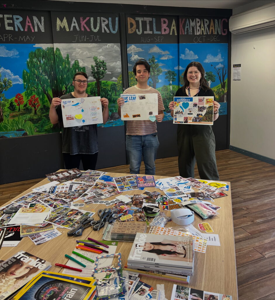 Young adult attendees and Blue Leaf Coordinator (Bec) presenting poster collages created at the Evaluation Workshop at Yallo. Two young adults and Blue Leaf Youth Worker (Bronte) posing with their collage posters at the Evaluation Yarn.