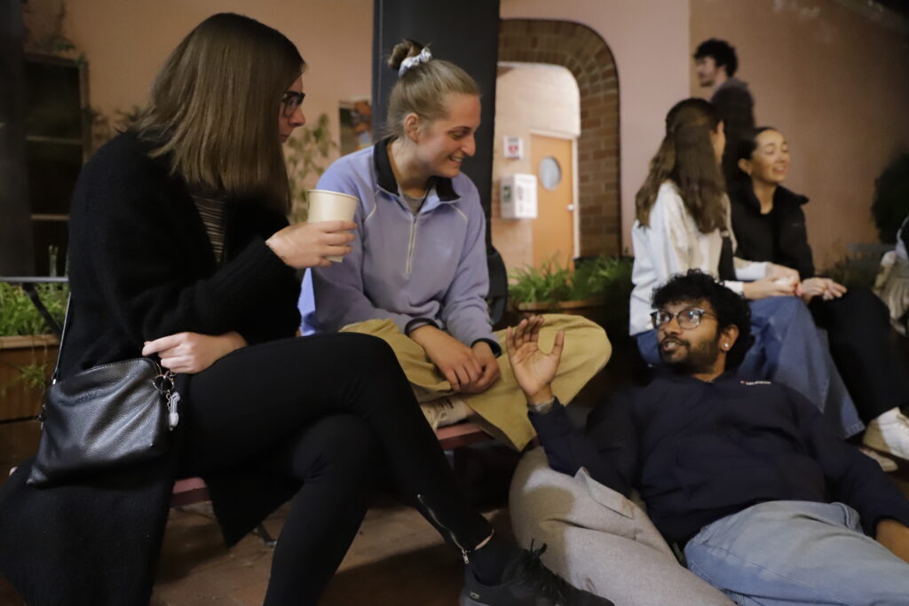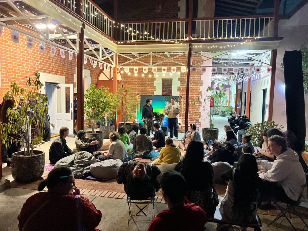Young adults having a discussion in the courtyard area of BRAG. Gathering of spectators watching on as presentations speeches and performances take place on stage.